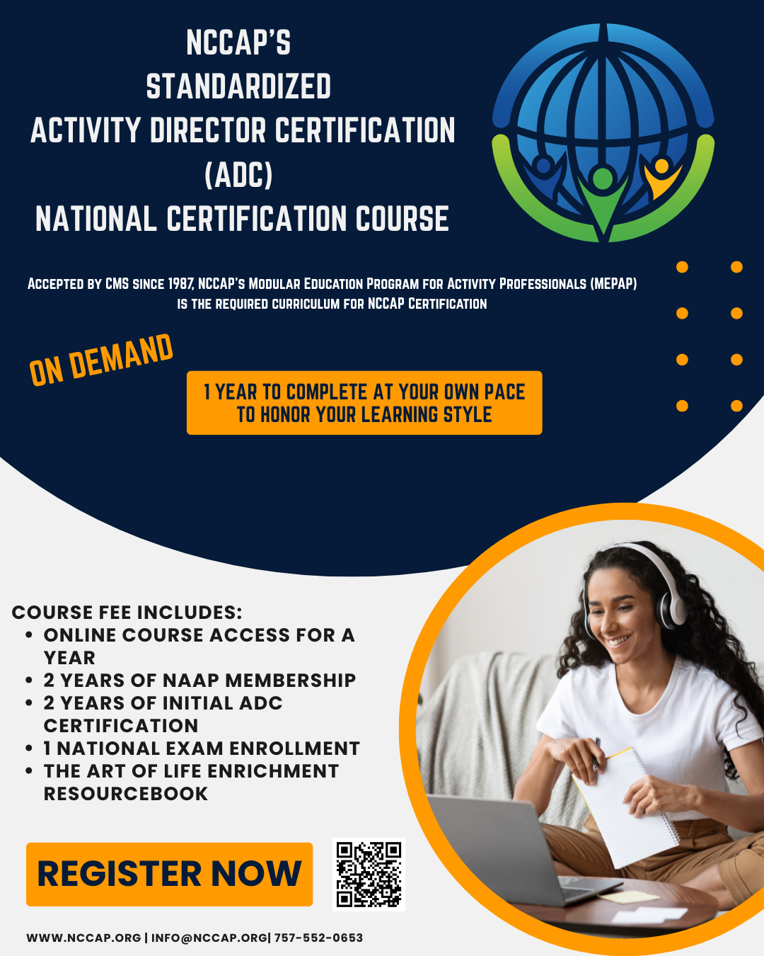 This is a self-paced, online course—so there’s no live instructor, and you can go through the lessons whenever it works best for you. When you successfully finish the course and exam (included ), you will be eligible for Assisted Living Enrichment Certification (ALEC) through the National Certification Council for Activity Professionals (NCCAP).